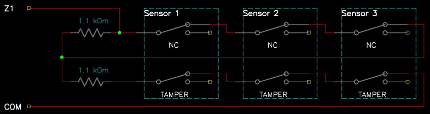 Зона в централи программируется как 2EOL/NC. В случае вскрытия датчика будет разрыв цепи, централь выдаст тамперную тревогу, при срабатывании тревожного контакта меняется сопротивление цепи с 1,1 кОм на 2,2 кОм, централь выдаст сигнал тревоги вторжения.
